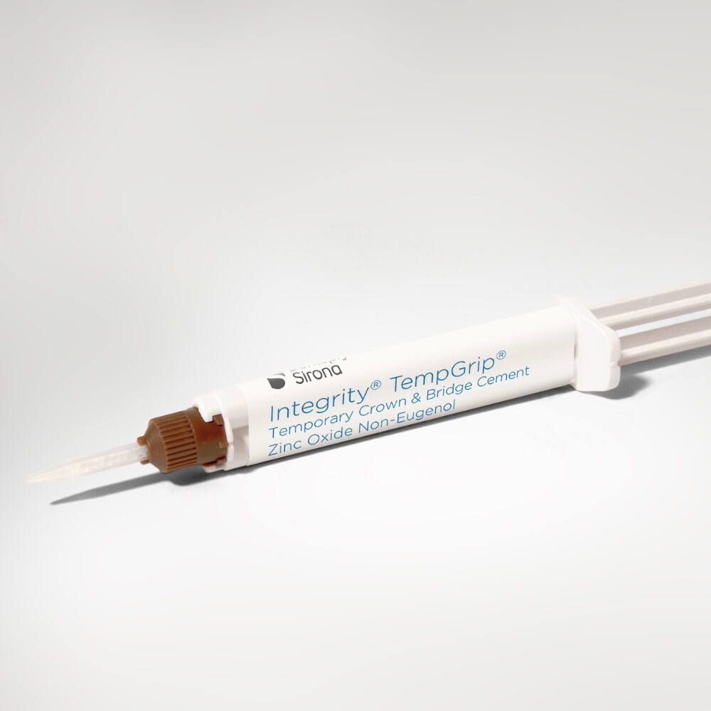 Integrity TempGrip Cement is an automatically mixed two-component material in a 1:1 9 g dual-barreled syringe based on zinc oxide/organic acids. Due to its non-eugenol formulation, it does not influence the setting of resin-based filling and luting materials.